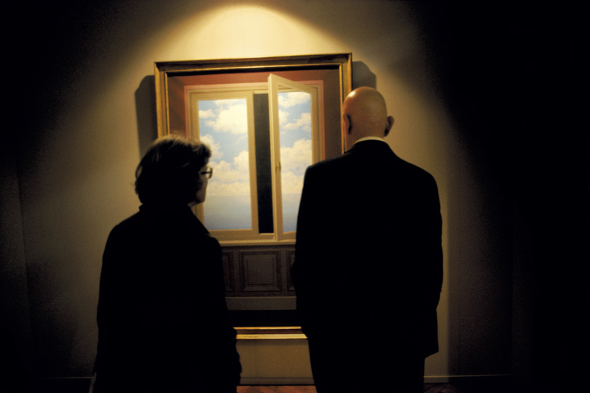 «En los años 70, fui a ver una exposición de Magritte en el Palais des Beaux-Arts de Bruselas. Tenía mi cámara encima, pero me dijeron «no hay fotos», así que la dejé en el ropero. Entré en la primera sala de la exposición y vi a este hombre calvo. Tenía una presencia muy fuerte, parado frente a una pintura de un hombre con calvicie y bombín. Furioso porque me había perdido esta imagen, fui a recuperar mi cámara. Pero había perdido el ticket del ropero y tuve que discutir durante aproximadamente diez minutos para recuperarlo.