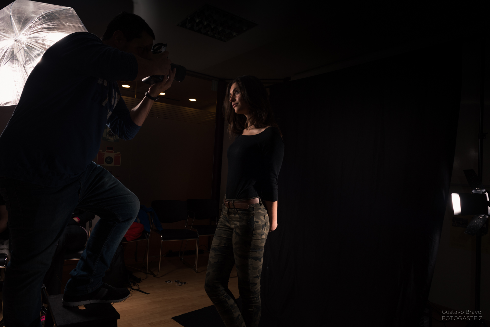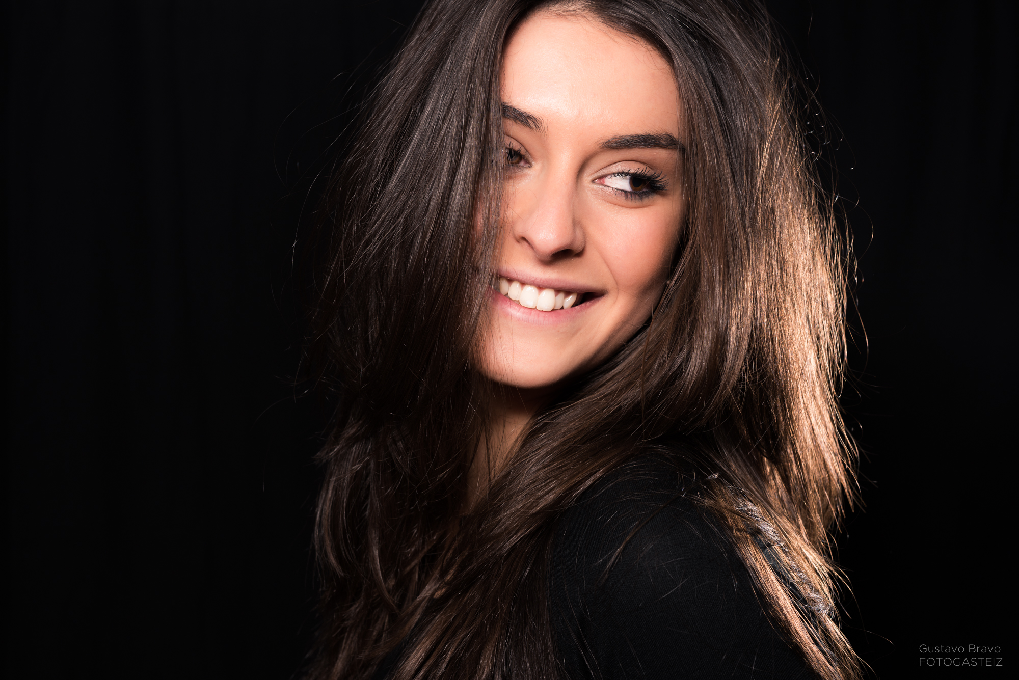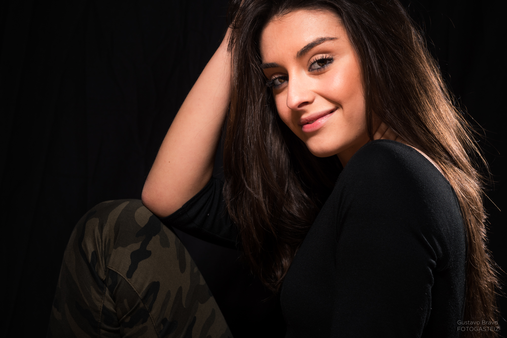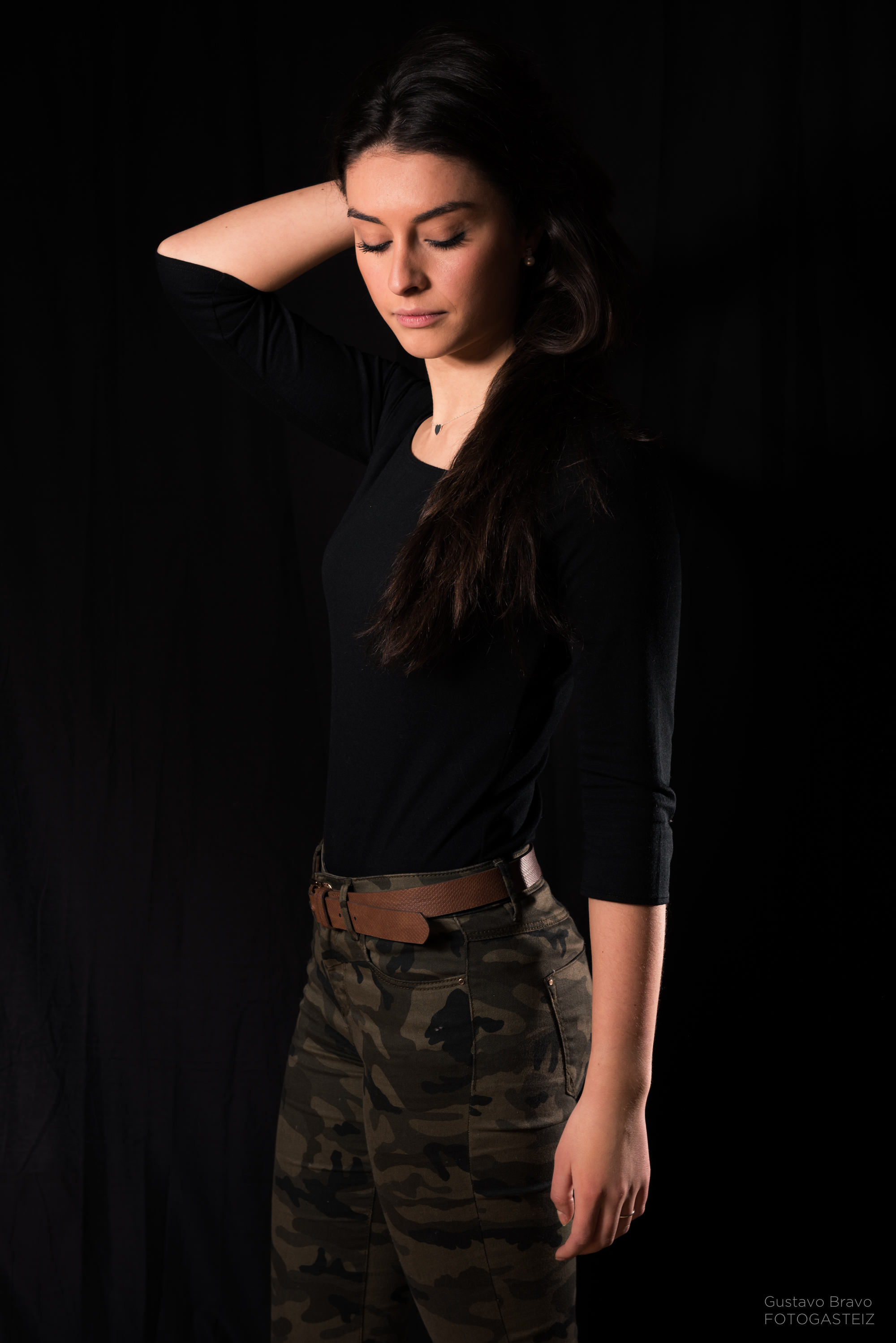 Esta serie de fotografías fue tomada durante una clase del curso de iluminación de estudio, con la modelo vitoriana Erika Villar, de MClass Moda, en la que practicamos la clave baja con luz de recorte o separación, que sirve para evitar que la modelo se funda con el fondo en una lado o zona concreta, tal y como se ve en la siguiente foto.
