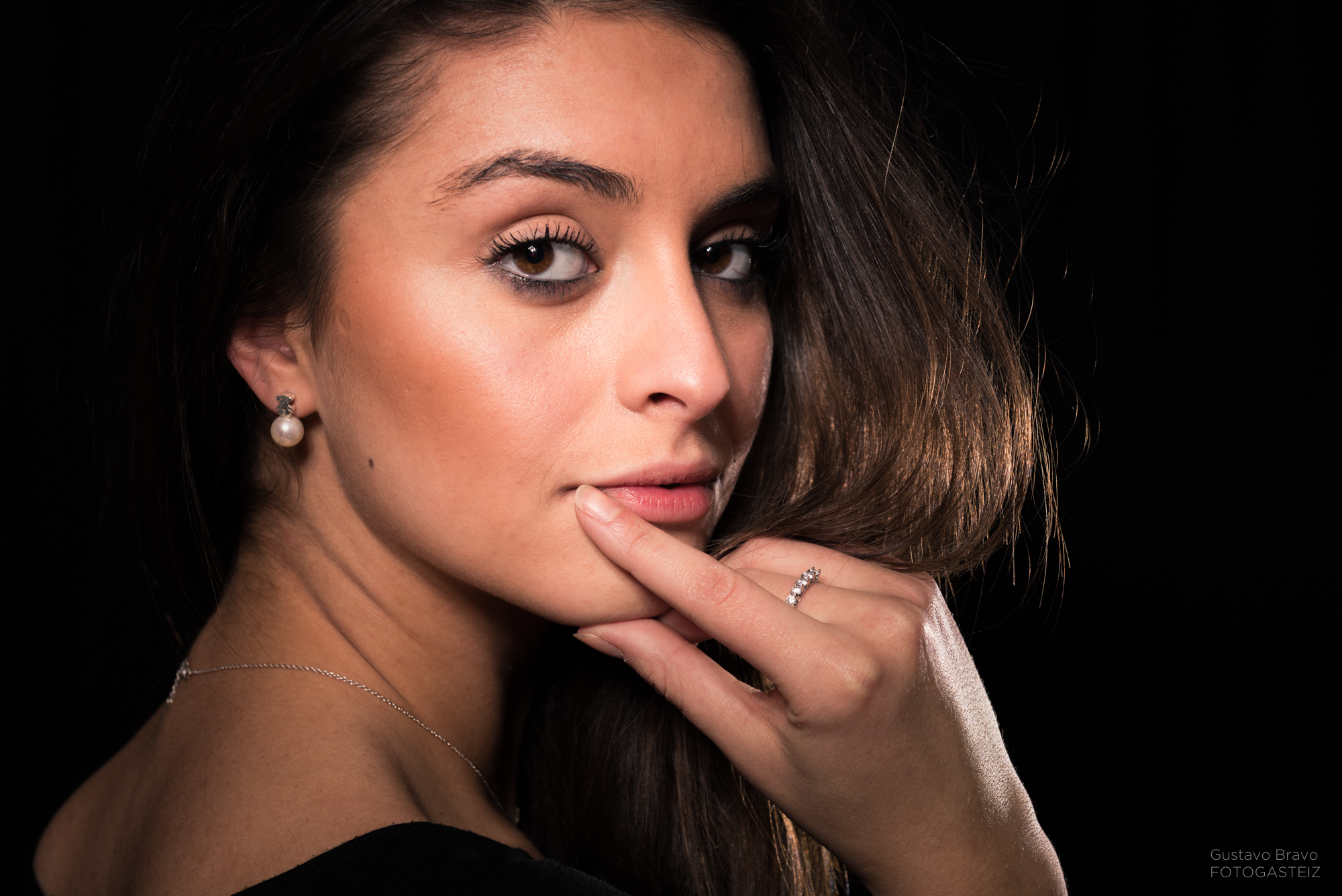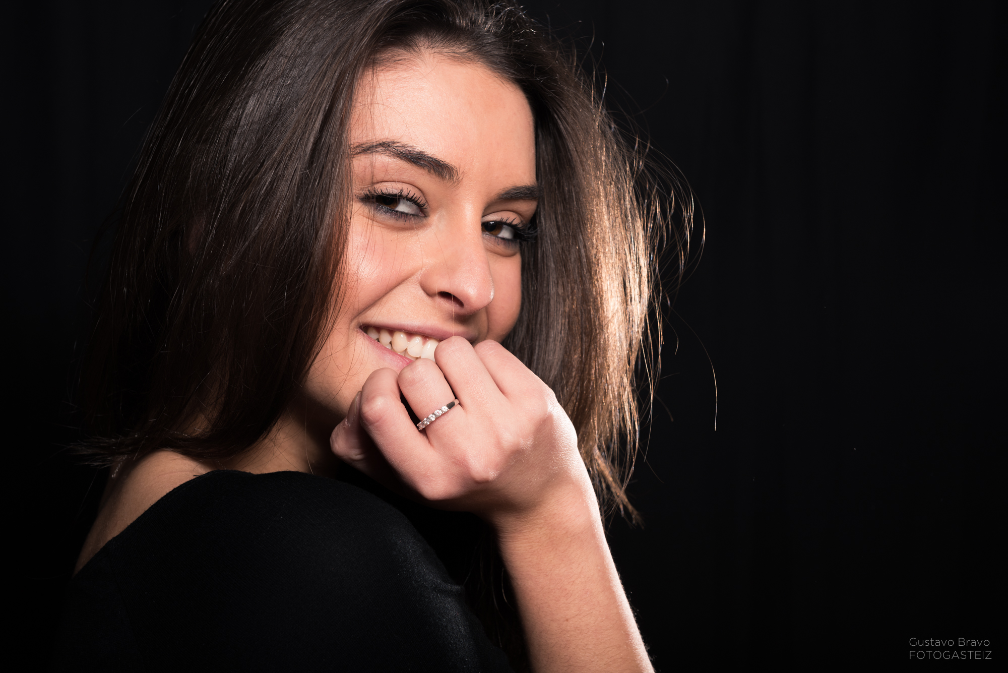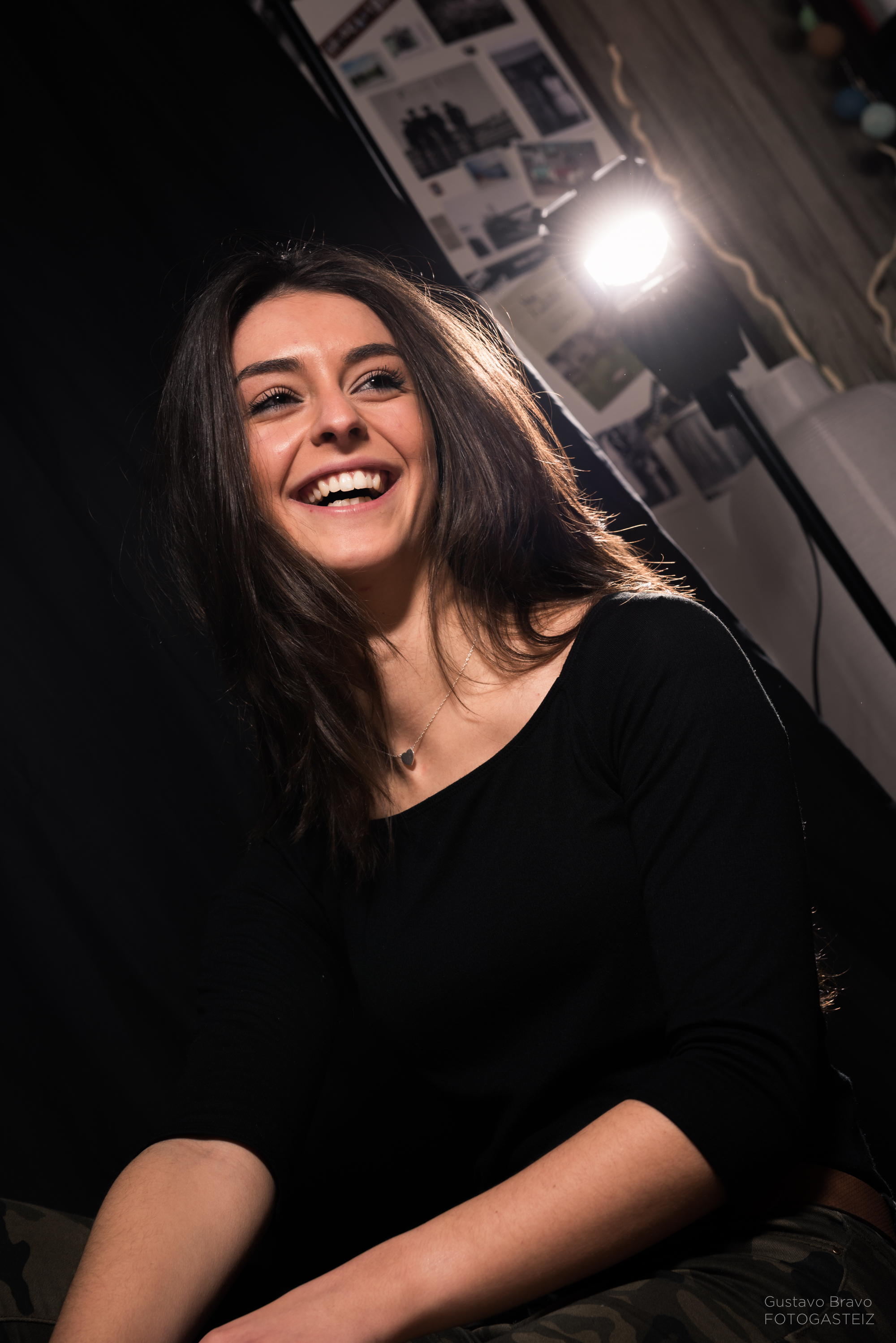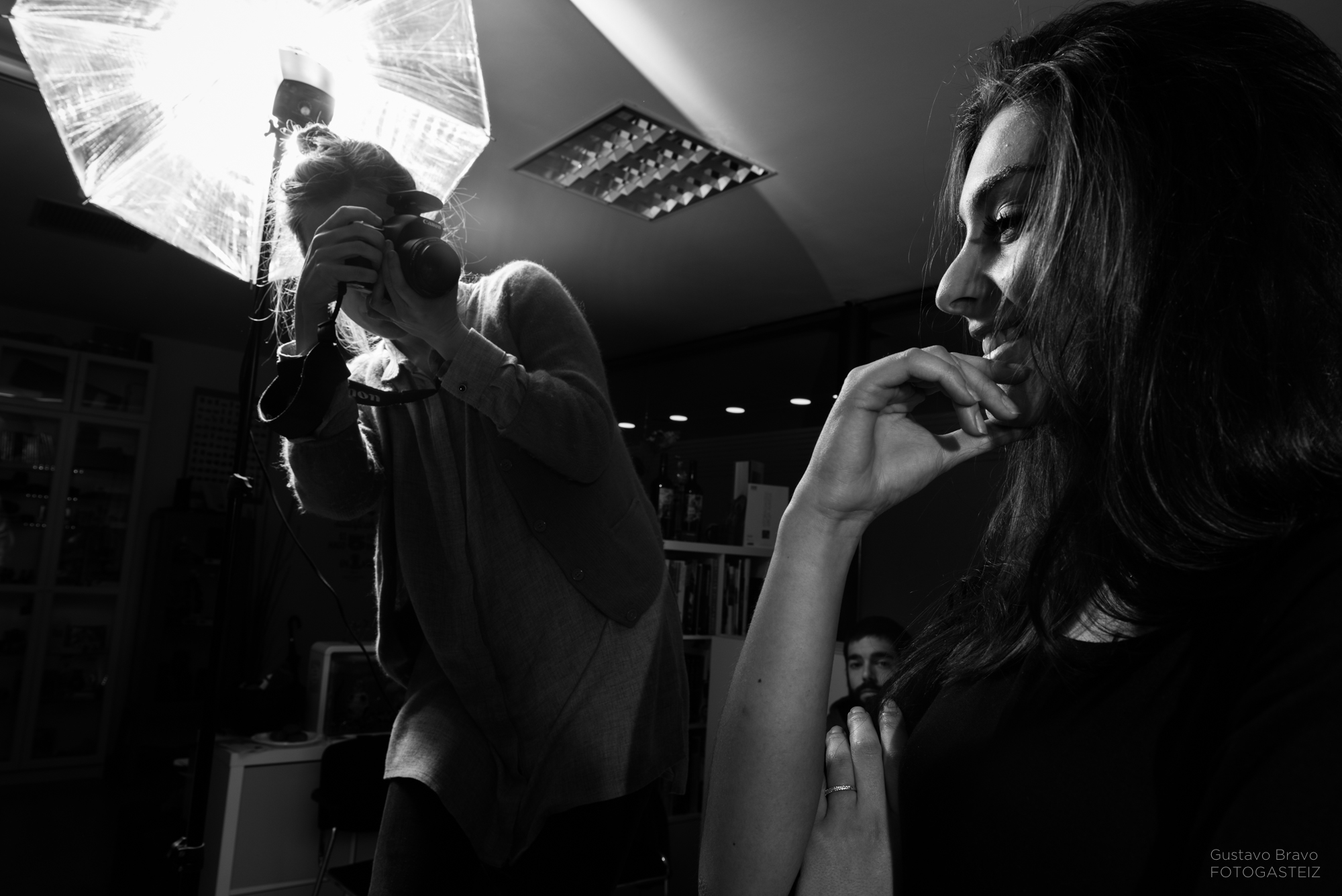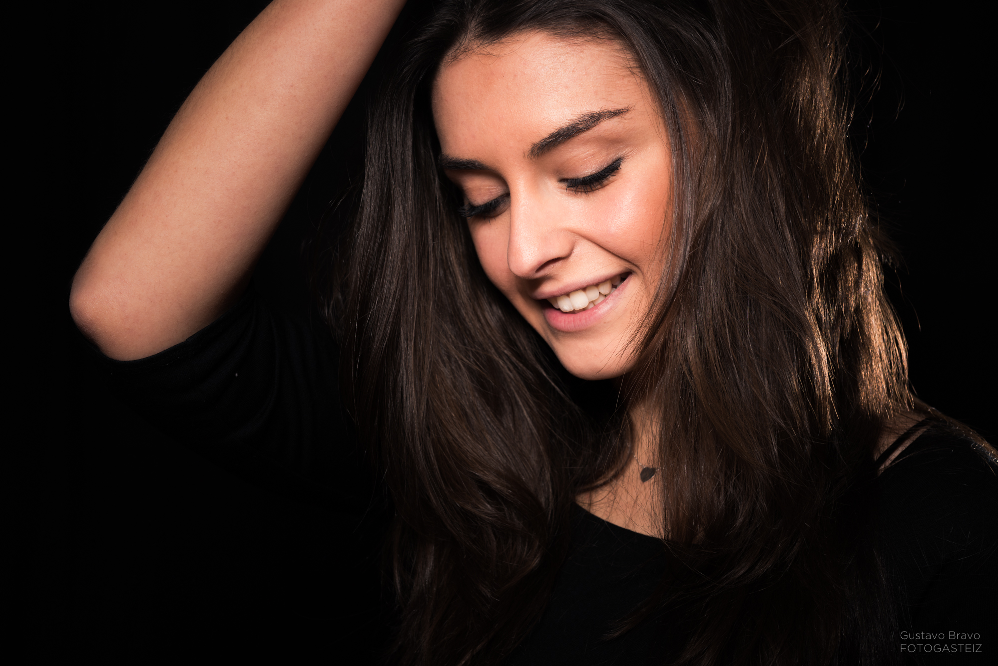 Esta serie de fotografías fue tomada durante una clase del curso de iluminación de estudio, con la modelo vitoriana Erika Villar, de MClass Moda, en la que practicamos la clave baja con luz de recorte o separación, que sirve para evitar que la modelo se funda con el fondo en una lado o zona concreta, tal y como se ve en la siguiente foto.